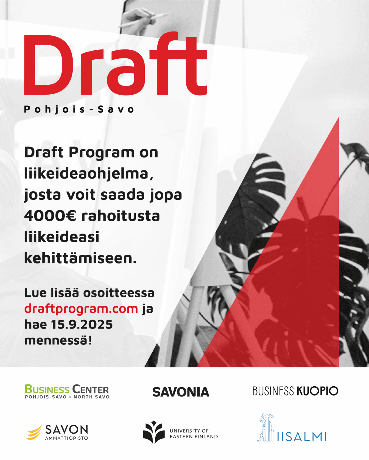 Voit hakea Draft Program -liikeideaohjelmaan Pohjois-Savossa, jos tiimissäsi on vähintään yksi henkilö, joka on kirjoilla Kuopiossa tai Iisalmessa, tai on Savonia-ammattikorkeakoulun, Itä-Suomen yliopiston tai Savon ammattiopiston opiskelija, henkilökunnan edustaja tai alumni, eli henkilö, joka on valmistunut jostakin näistä oppilaitoksesta.