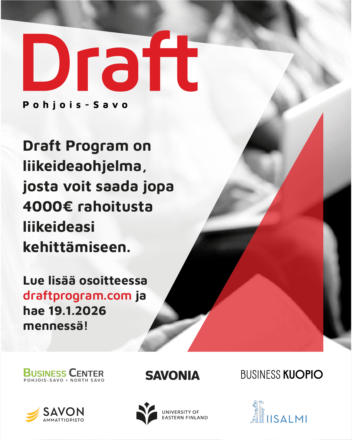 Voit hakea Draft Program -liikeideaohjelmaan Pohjois-Savossa, jos tiimissäsi on vähintään yksi henkilö, joka on kirjoilla Kuopiossa tai Iisalmessa, tai on Savonia-ammattikorkeakoulun, Itä-Suomen yliopiston tai Savon ammattiopiston opiskelija, henkilökunnan edustaja tai alumni, eli henkilö, joka on valmistunut jostakin näistä oppilaitoksesta.