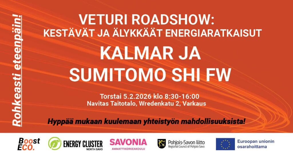 Liity mukaan ja hyödynnä Business Finland  Veturi Roadshow -päivän mahdollisuudet. Tällä kertaa BoostECO:n vieraaksi Varkauteen saapuvat Kalmar ja Sumitomo SHI FW.  Lisäksi kuulemme esimerkkejä menestyksekkäästä yhteistyöstä pohjoissavolaisten pk-yritysten näkökulmasta. Veturit kutsuvat yrityksesi mukaan verkostoihinsa – innovoimaan, kehittämään ja kasvamaan yhdessä.