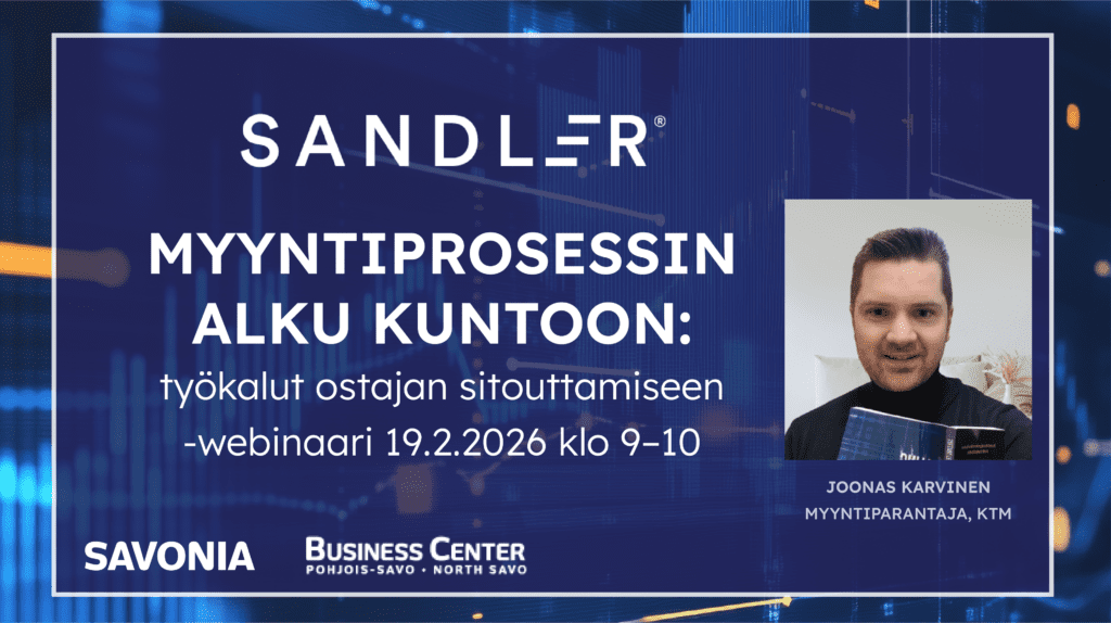 Kouluttajana: Kasvua vauhdittava myynnin valmentaja Joonas Karvinen, Sandler-sertifioitu myyntiparantaja ja Business Center Pohjois-Savon yhteistyökumppani.